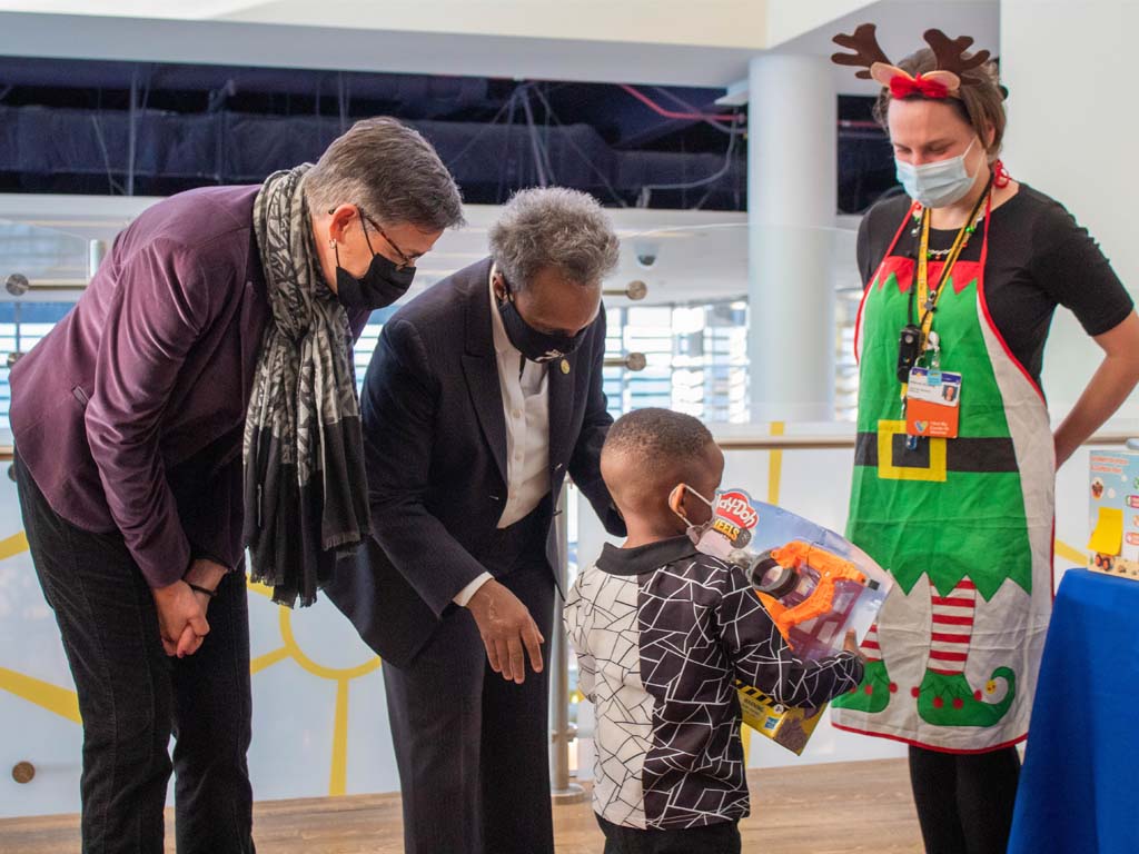 Mayor Lightfoot and First Lady Amy Eshleman joined our team of hardworking elves passing out gifts to kids visiting the hospital.