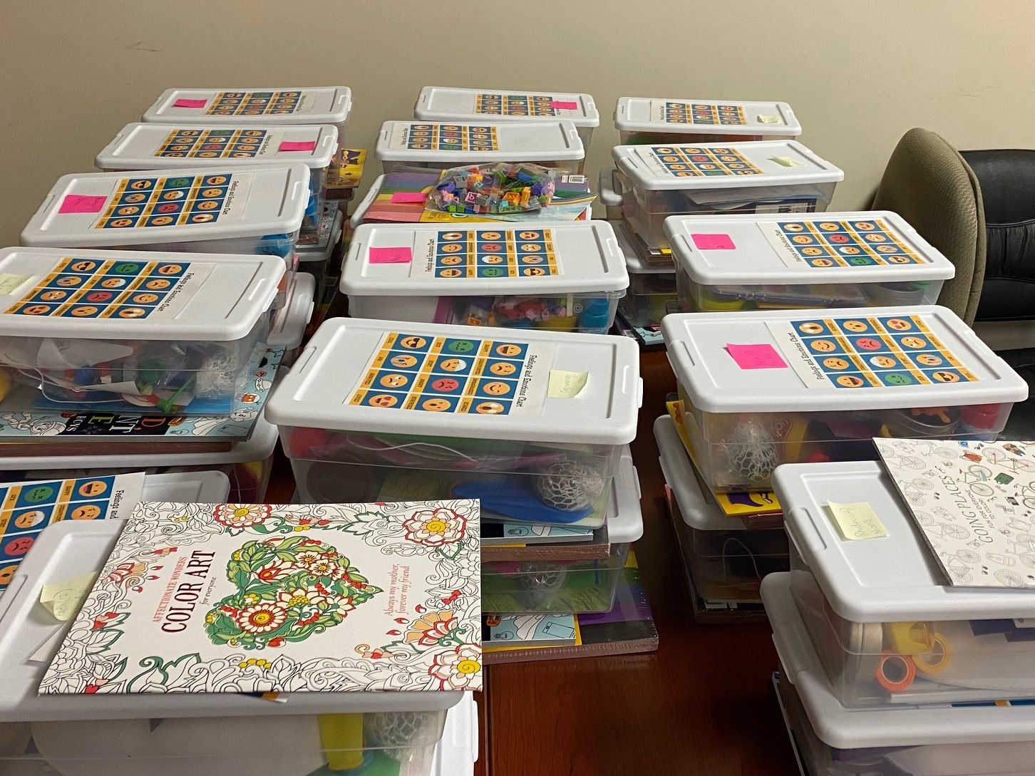 Also included in the therapy kits are calm-down tools including stress balls, stress putty, and fidget toys.
