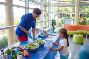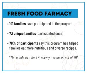 The Fresh Food Farmacy started in 2021 and since, La Rabida and Just Roots, a local organization with two community farms, supplies fruits and vegetables for our families to take home. The program offers families various ways to pick up their produce order, curbside or walk up to the stand. Also, families can learn from a chef, who donates time to the program and leads monthly cooking demonstrations with kid-friendly recipes.
