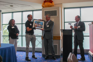 Ezekiel, second from the left, personally presents a watercolor painting of La Rabida's outpatient building to retiring board member Dan Real at this year's annual board meeting.
